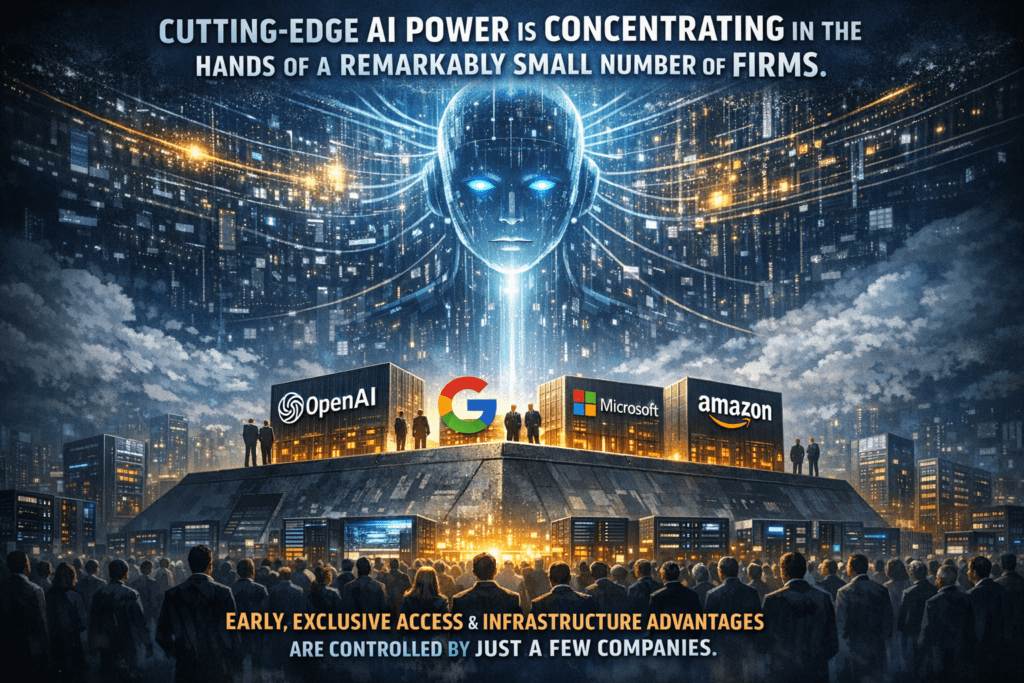 The newest, most capable AI models, and crucially the infrastructure and integration advantages that come with early and exclusive access to them, are concentrating in the hands of a remarkably small number of firms. And the mechanisms that are enabling this concentration are not accidental. They are structural, self-reinforcing, and — if current trajectories hold — increasingly difficult to reverse.