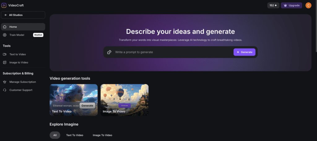 Video Craft Studio: This specialized area within Imagine Art focuses on video generation and editing. Users can explore community-created videos for inspiration, understand the prompts and models used, and recreate or modify these videos to suit their needs. The integration of community insights fosters a collaborative environment where users can learn from each other’s successes and experiments.
