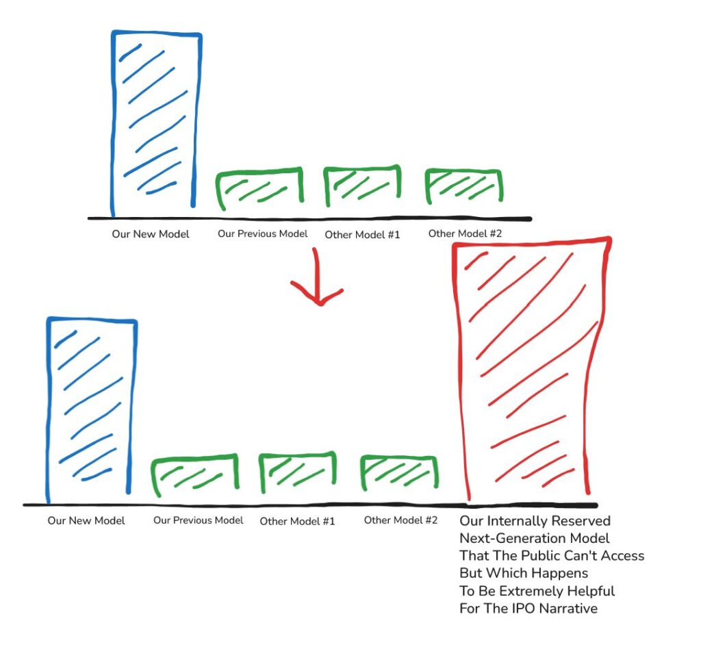 No other frontier lab talks like this. OpenAI does not publish a “here’s our better internal model, which we have chosen not to release” chart. Google does not either. As Bruce Schneier observed in his take on Mythos, the standard industry playbook is the opposite: make the released product look like the frontier, and quietly sit on anything more capable. Anthropic has inverted the playbook. They have drawn a line on the floor labeled what we shipped, a line on the ceiling labeled what we have, and told you in footnote-polite English that the distance between them is a deliberate safety decision.