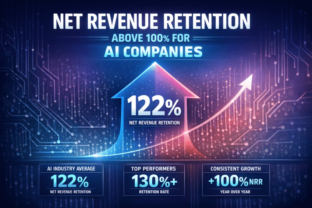 Net Revenue Retention above 100% is the gold standard. It means existing customers are expanding their usage faster than any customers are churning. According to ChartMogul’s SaaS Benchmarks Report, a high NRR often correlates with better growth, efficiency, and higher valuations. B2B AI companies with NRR above 110% are in elite territory.