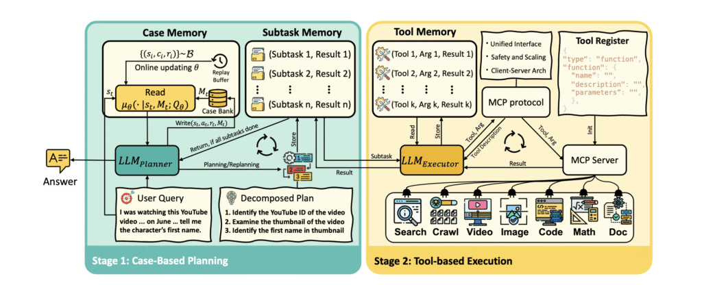 The practical instantiation of Memento as a deep research agent showcases the framework’s versatility and power. The system operates through an elegant alternation between two core stages: Case-Based Planning and Tool-Based Execution, orchestrated through three specialized memory modules.