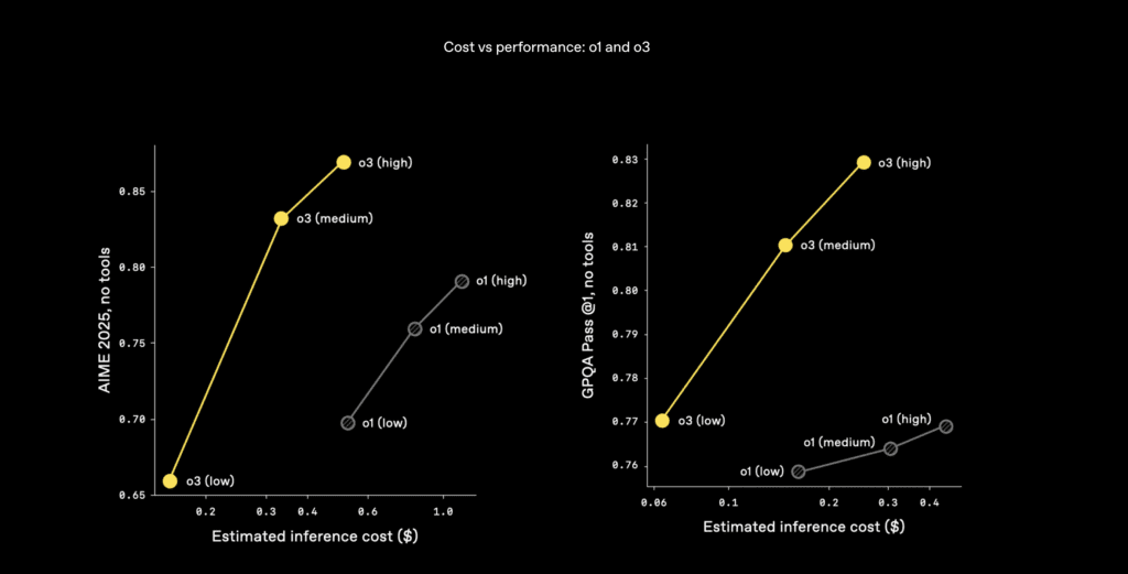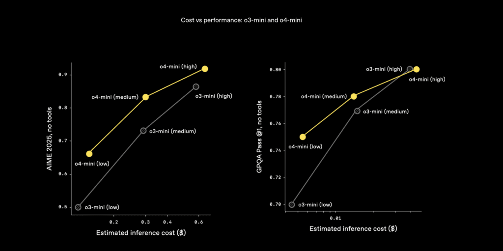This concept is known as test-time compute scaling – you can decide per query how much brainpower to spend. O3 at full blast might be 30x slower than GPT-4 on a single query if it’s doing a very long chain-of-thought, but it will be far more accurate. O4-mini might usually run with a shorter chain-of-thought, making it faster.