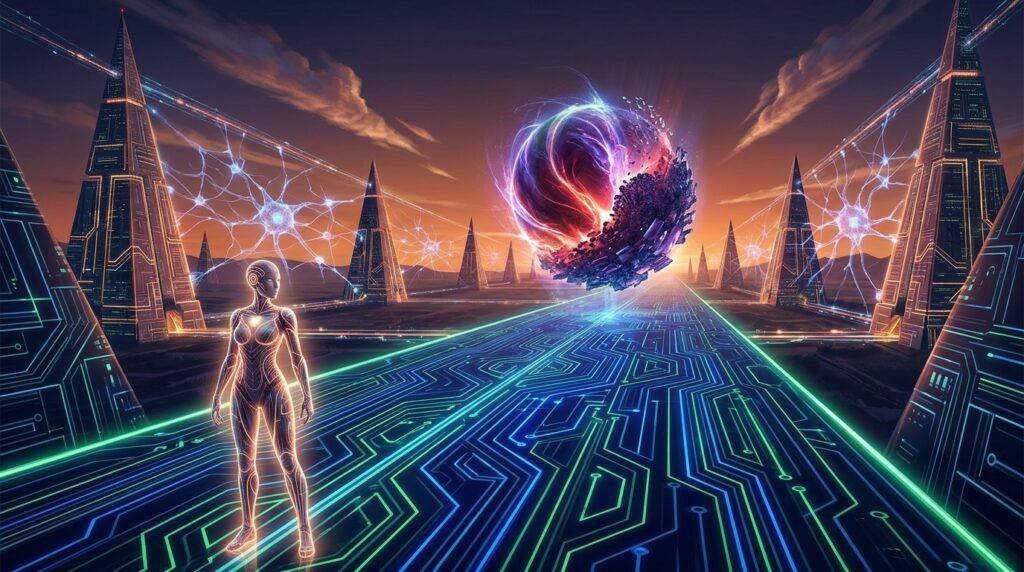 A futuristic digital scene showing a glowing AI interface generating music waves, with a silhouetted musician on one side and towering corporate buildings labeled “Music Labels” on the other. Between them, a glowing divide symbolizes conflict, with floating musical notes transforming into binary code.